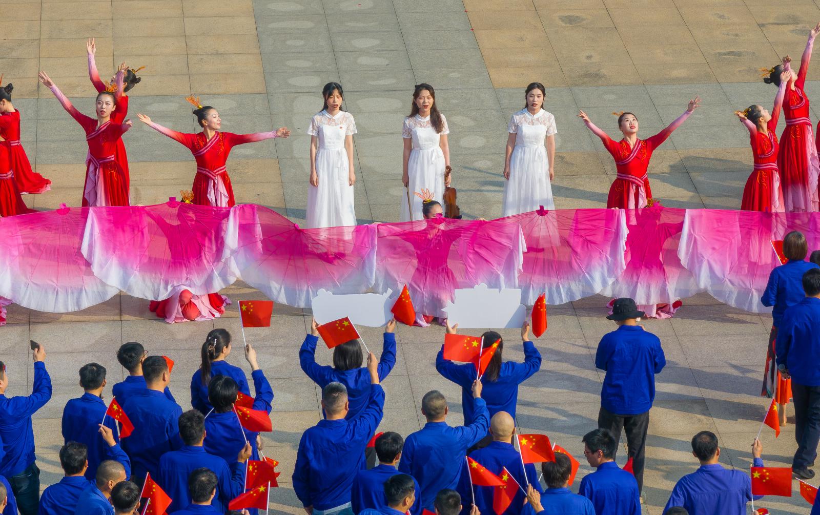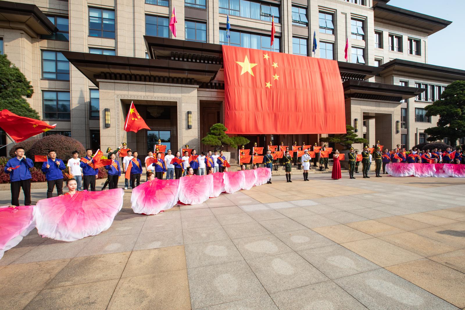 上午8时,,,, ,,升旗仪式正式最先,,,, ,,陪同着国旗护卫队雄壮的脚步和激昂的国歌声,,,, ,,鲜艳的五星红旗迎着旭日冉冉升起,,,, ,,各人面向国旗肃立行礼,,,, ,,向国旗致以最高尚的敬意。。。。。。紧接着,,,, ,,陪同着《我和我的祖国》悠扬的小提琴声音响起,,,, ,,国庆快闪运动正式拉开序幕。。。。。。AG真人总部集团有限公司|首页各单位代表挥舞着小国旗,,,, ,,和演员们一起唱响《大中国》《咱们工人有实力》《红旗飘飘》,,,, ,,群集在行政楼广场的大国旗下,,,, ,,场上气氛热烈、红旗招展,,,, ,,汇聚起磅礴奋进实力,,,, ,,全场大合唱《赞美祖国》把运动推向热潮,,,, ,,唱出了AG真人总部集团有限公司|首页人对祖国的礼赞。。。。。。